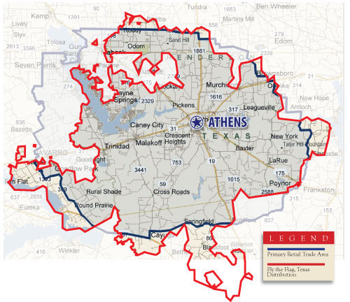 Fly the Flag, Texas is distributed by mail each month to a targeted list of over 20,000 homes in our primary retail trade area (courtesy of the AEDC). The primary retail trade area is indicated in blue and can be thought of as showing where the dollars spent in our community come from. Fly the Flag, Texas reaches every home in Athens (75751, 75752), LaRue (75770), Malakoff (75148) and Trinidad (75163), as well as 10,000 of the highest value homes within our trade area in Murchison (75778), GBC (75156), Mabank (75147), Eustace (75124), Kerens (75144) and Montalba (75853). There is no local publication with a greater or more focused reach. |
